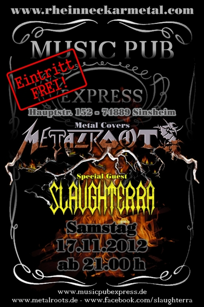 Kleine Erinnerung: Kommenden Samstag, 17.11.2012 gibt's im Express in Sinsheim mächtig was auf die Lauscher: Heavy Metal Grundschule mit Metalroots, anheizen werden die Jungs von Slaughterra. Los geht's um 21:00 Uhr - Wie immer im Express heisst es: EINTRITT FREI!