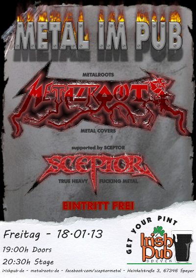 Einige Updates zum Gig in Speyer am 18.01.2013: Support sind an diesem Abend die Kollegen von SCEPTOR. Los geht's um 20:30 Uhr - Der EINTRITT ist FREI!