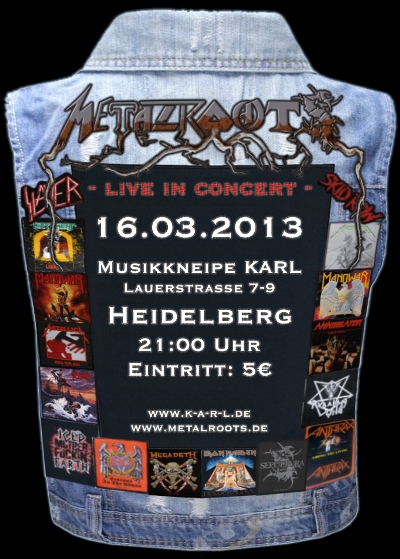 Denkt dran: Kommenden Samstag steigt der letzte Metalroots-Gig mit Nik am Mikro, danach liegt unsre Band erst mal auf unbestimmte Zeit auf Eis, bis ein neuer Shouter gefunden wird. Seid dabei, es gibt über 2 Stunden Heavy Metal Grundschule auf die Lauscher! In der Rock-Kneipe Karl in der Heidelberger Altstadt ab 21:00 Uhr.